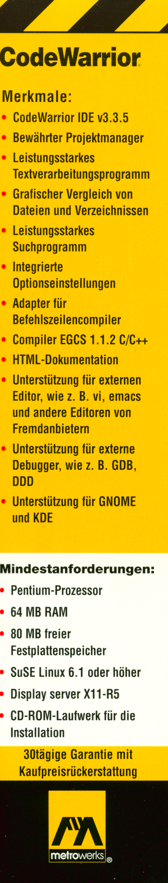Endlich ein einfacher Einstieg in das Programmieren für Linux mit dem preisgekrönten CodeWarrior. Verwenden Sie dieselbe IDE, mit denen mehr als 200.000 Programmierer arbeiten, um „Killer-Anwendungen”, wie Netscape Navigator, Adope Photoshop und viele andere Programme zu entwickeln.